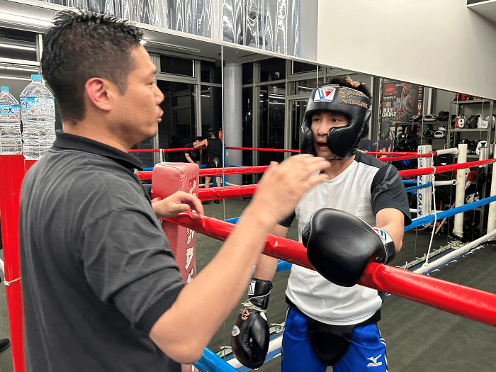 川浦 合わせやすいですね。ただ、どう合わせに行くかですね。変に合わせに行くと危ないですし、8オンスのグローブなんで、スパーとはまた全然違いますからね。イメージは持ちつつ、でも、それがすべてとは思わないで。実際に向かい合って、感覚を合わせてからですね。スパーはもう2年前なので、変わっているところもあると思いますし。ただ、自信は持っていきたいです。
