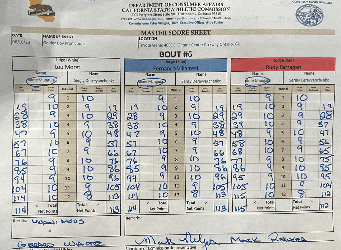 互いに譲れないまま試合は終盤までもつれ、最終12回にムンギアがボディブローでデレフヤンチェンコをキャンバスに沈めた。ムンギアはKOを狙ったが、デレフヤンチェンコが最後まで踏ん張って判定決着。7642人のファンが興奮し、主催のGBPが「年間最高試合候補」と胸を張るファイトとなった。スコアは115-112、114-113×2でムンギアの手が挙がった。